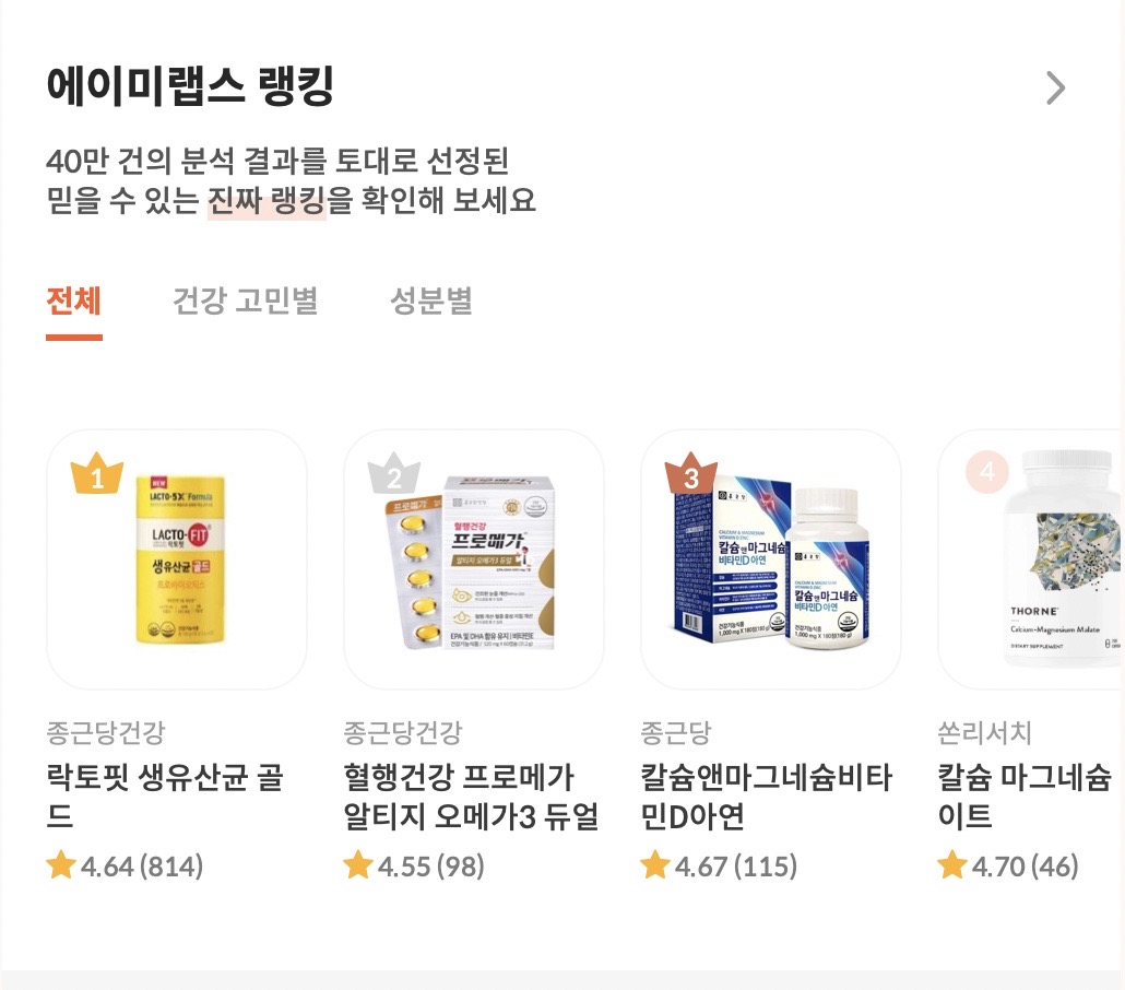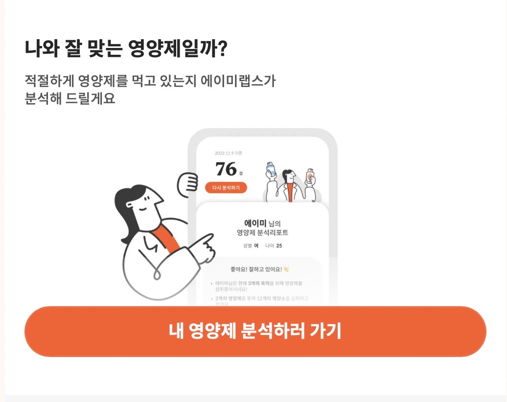 내가 현재 먹고 있는 영양제 조회 후 저렇게 결과가 나오면 자체 홈페이지에서 영양제 추천도 해주고