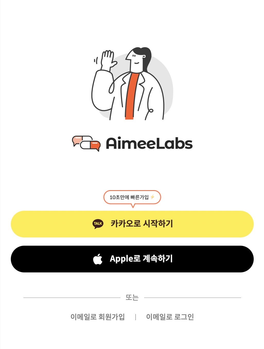 - 회원가입 또는 로그인: 에이미랩스(AimeeLabs) 페이지에서 이메일 또는 카카오, 애플 계정을 통해 회원가입을 완료합니다.