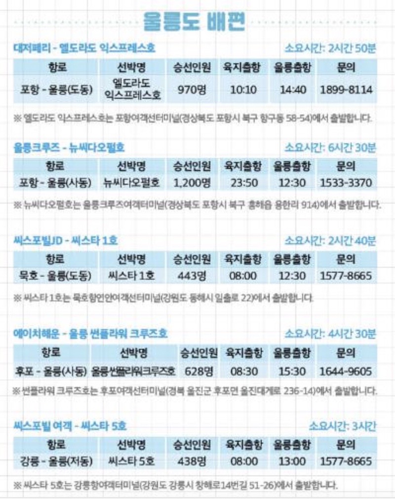 특히 배편으로 이동한 후 울릉도 내부 교통편을 확인하는 데 유용한 정보들이 담겨 있으니 참고하시길 바랍니다.