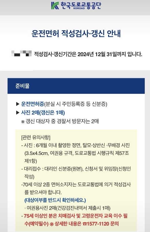이 외에도 운전면허가 취소될 위험이 있으므로 아래 내용을 확인 후 반드시 정해진 기간 내에 검사를 완료하시기 바랍니다.