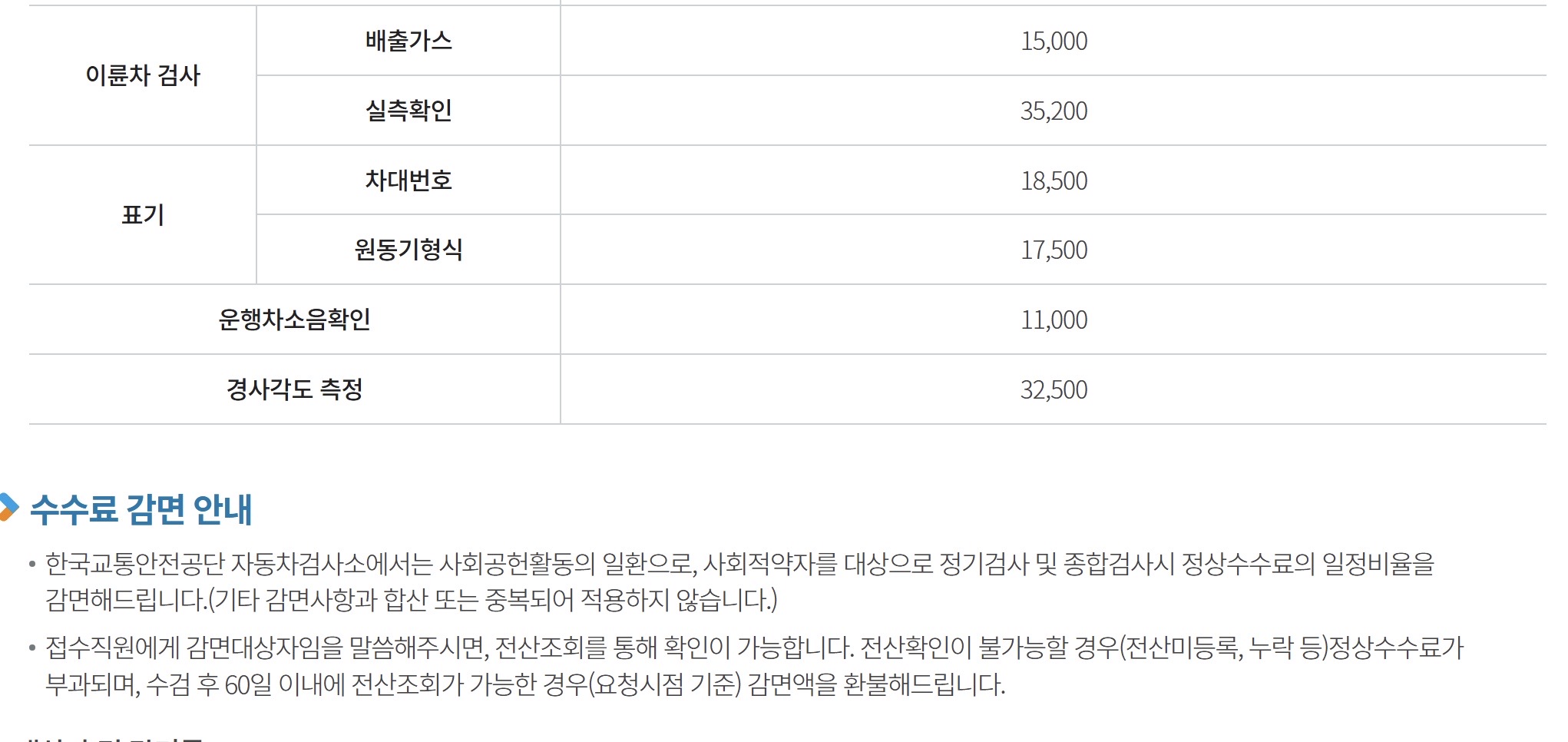 일부 차량 소유자는 사회적 약자 지원 정책에 따라 검사 수수료 감면 혜택을 받을 수 있습니다.